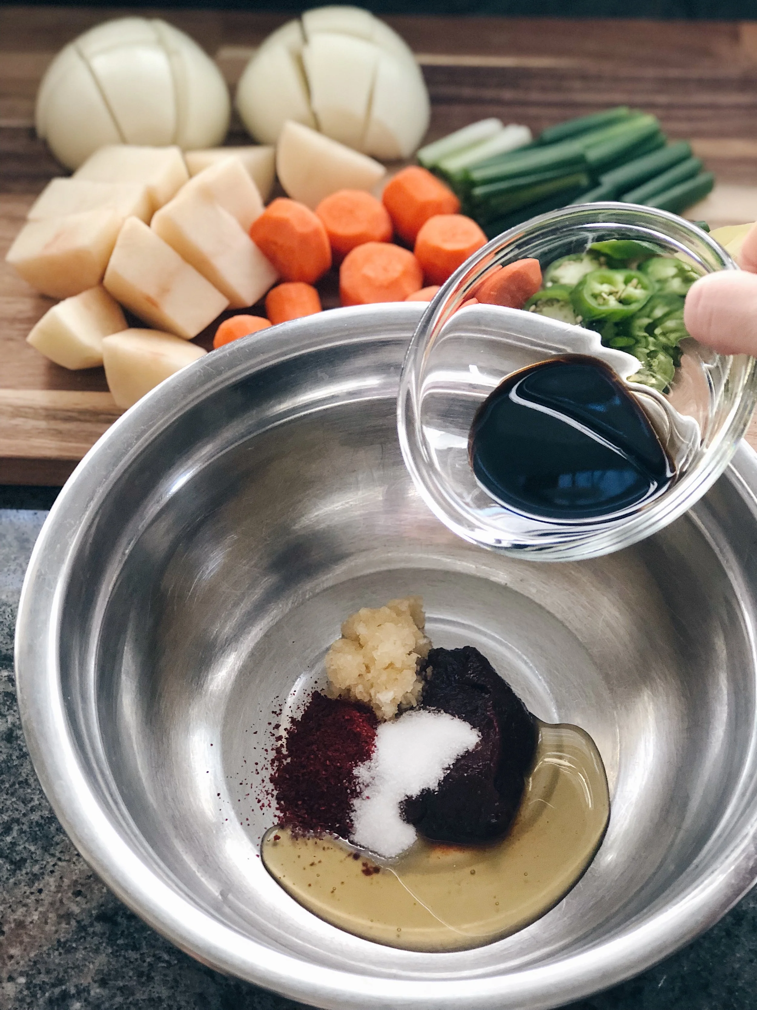 In a large mixing bowl, prepare the marinade by adding the soy sauce, gochugaru, gochujang, minced garlic, sesame oil, sugar and honey together and mix well.